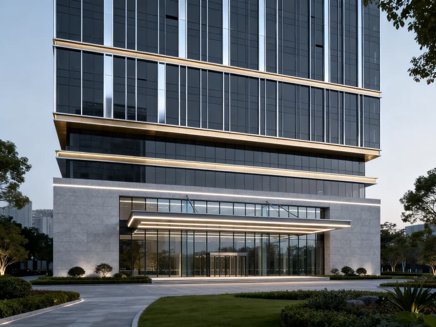 該2700平寫(xiě)字樓以“現(xiàn)代商務(wù)?高效協(xié)同”為核心設(shè)計(jì)方向,按“公共接待-核心辦公-輔助配套”的動(dòng)線邏輯規(guī)劃空間,內(nèi)外風(fēng)格高度統(tǒng)一,適配中小規(guī)模企業(yè)集群辦公場(chǎng)景。外立面采用淺灰金屬幕墻與高透Low-E玻璃組合,縱向銀灰色金屬線條勾勒立面輪廓,橫向線條規(guī)整劃分功能區(qū)域,入口設(shè)淺灰石材門(mén)廊與無(wú)框玻璃門(mén),搭配嵌入式條形燈,既保障采光與通行效率,又以簡(jiǎn)潔大氣的造型強(qiáng)化商務(wù)辨識(shí)度,門(mén)前預(yù)留小型綠植景觀,柔化商務(wù)空間的嚴(yán)肅感。?