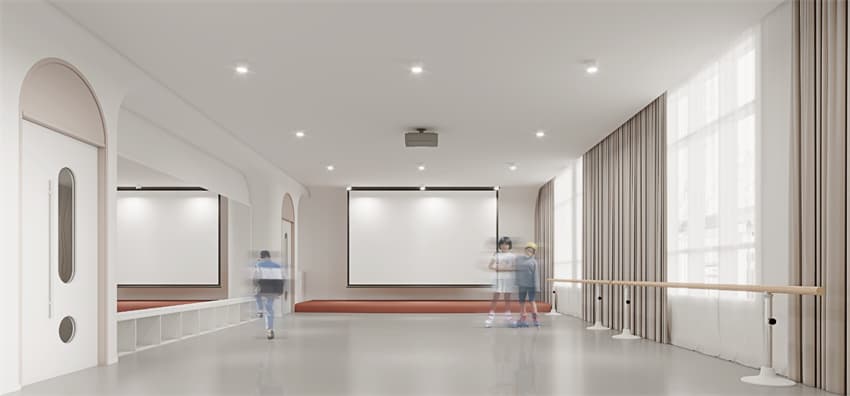 內(nèi)部公共區(qū)域的墻角進(jìn)行了圓弧處理,部分墻體采用自由曲線的表達(dá)手法,突出其好奇心,激發(fā)孩子探索的欲望,整個(gè)空間我們采用了白色系列,象征著孩子純潔無(wú)垢的心靈,同時(shí)為老師和孩子提供了更廣闊的發(fā)揮和想象空間。
