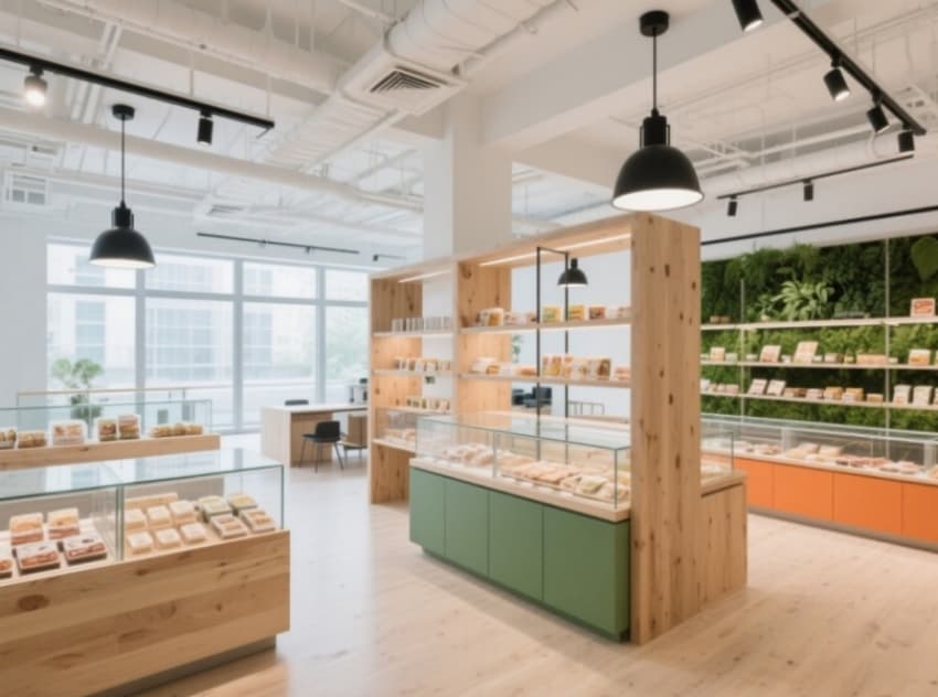 空間大量運用再生木材與微水泥材質,開放式辦公區(qū)的原木長桌嵌入綠植槽,天花裸露的金屬管線噴涂啞光白漆,與定制的弧形布藝沙發(fā)形成材質碰撞。會議室以透明玻璃圍合,墻面裝飾食品插畫與真實食材標本框,休閑區(qū)設置仿真面包造型的洽談凳,茶水間的瓷磚拼貼模擬面包肌理。?