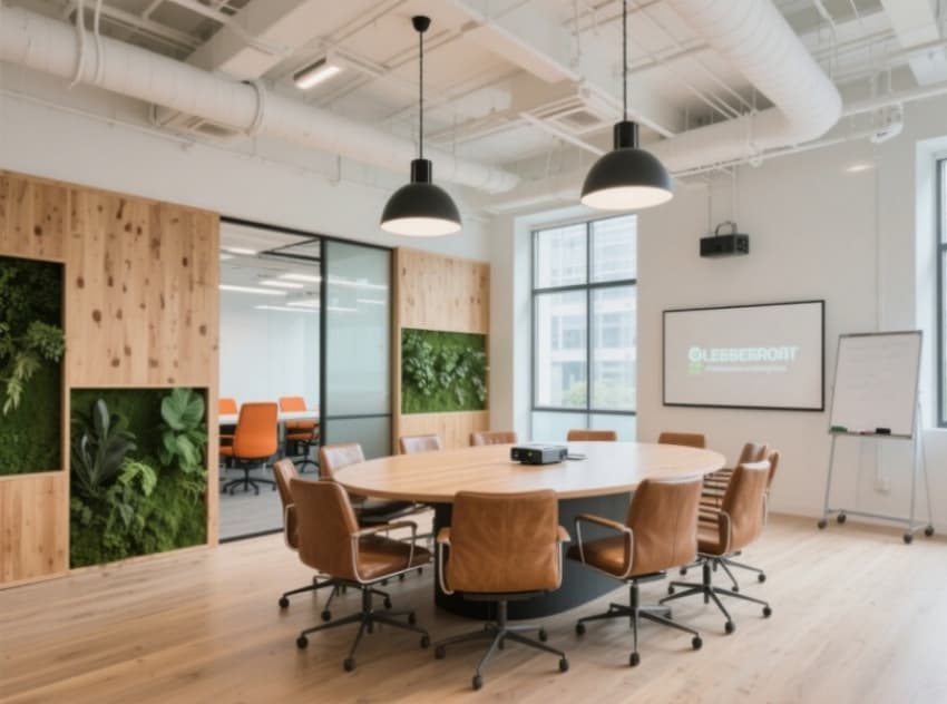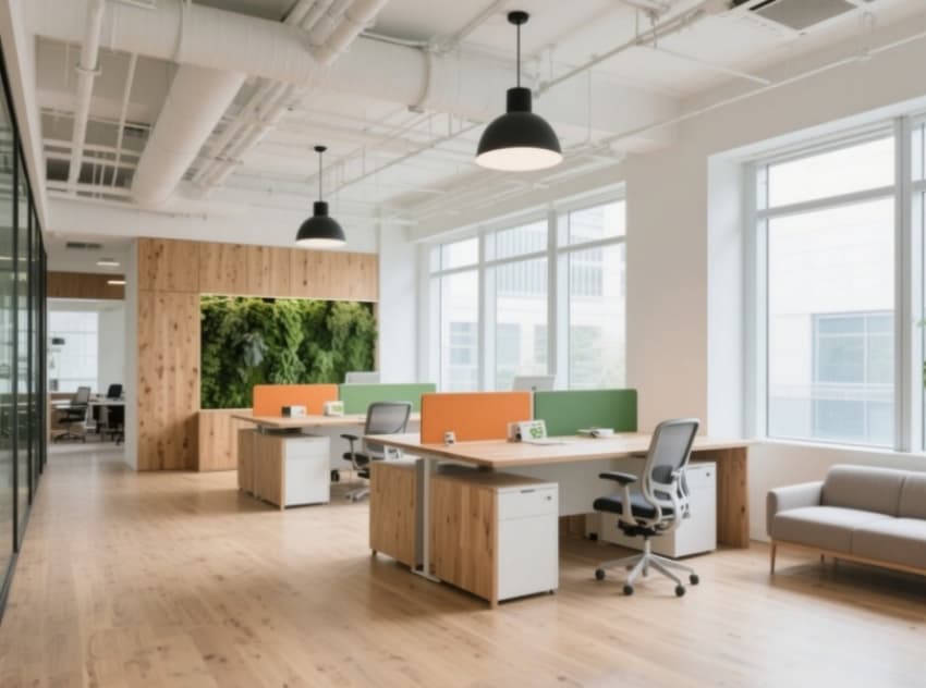 該食品零售公司辦公空間設計,以自然清新的現(xiàn)代輕工業(yè)風格為核心,形成統(tǒng)一且富有行業(yè)辨識度的視覺體系。整體色調提取自食材原生色彩——淺木黃打底,搭配牛油果綠、奶油白與燕麥棕,通過漸變玻璃隔斷與半通透紗簾營造層次分明的柔和光影。?