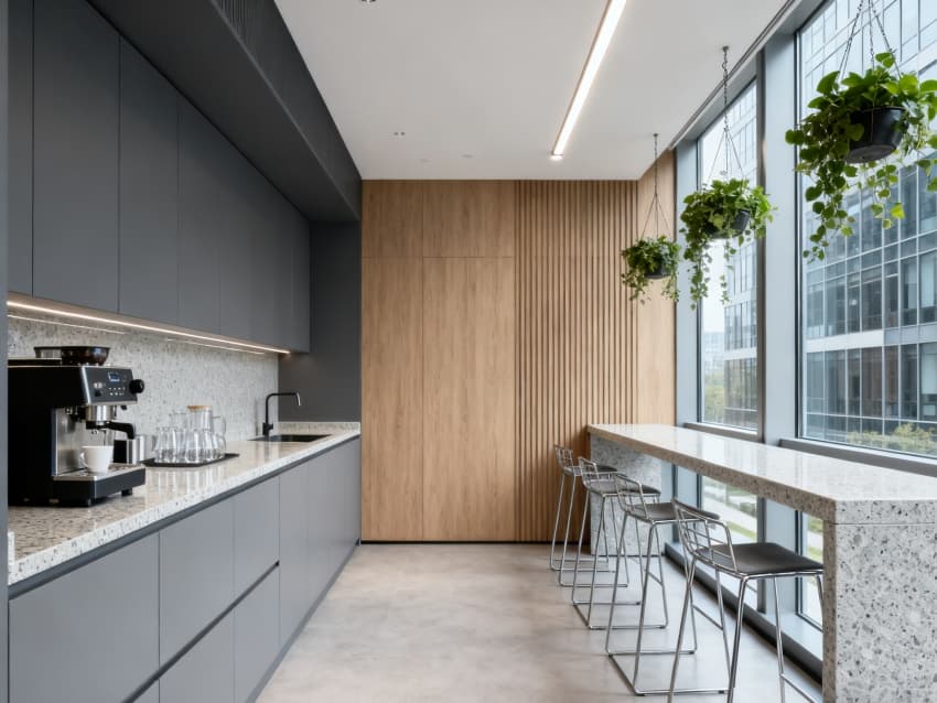 整體以淺灰、白色、淺木色為基調(diào),通過統(tǒng)一材質(zhì)(金屬線條、玻璃、石材)貫穿三層,避免空間割裂;同時融入適光設(shè)計與隱藏式收納,讓簡約風(fēng)格不流于單調(diào),實現(xiàn)“功能適配+視覺統(tǒng)一+體驗舒適”的辦公場景需求。