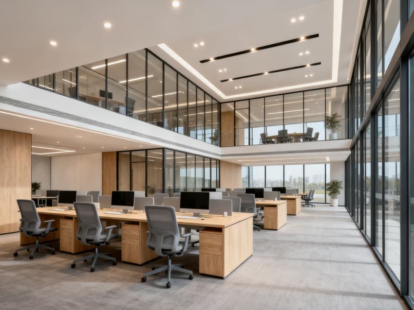 內(nèi)部設(shè)計緊扣“垂直功能分層”理念:一層聚焦“公共接待”,設(shè)開放式前臺、訪客休息區(qū)與員工茶水間,淺灰大理石地面搭配白色吊頂,通透格局降低訪客陌生感;二層為“核心辦公區(qū)”,模塊化工位結(jié)合淺木色隔斷,預(yù)留靈活協(xié)作空間,防靜電地板與吸音吊頂提升辦公效率;三層側(cè)重“私密與決策”,布局高管辦公室、大型會議室與資料檔案室,玻璃隔斷保障采光的同時,通過深灰軟裝強化私密性。?