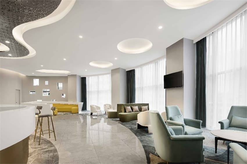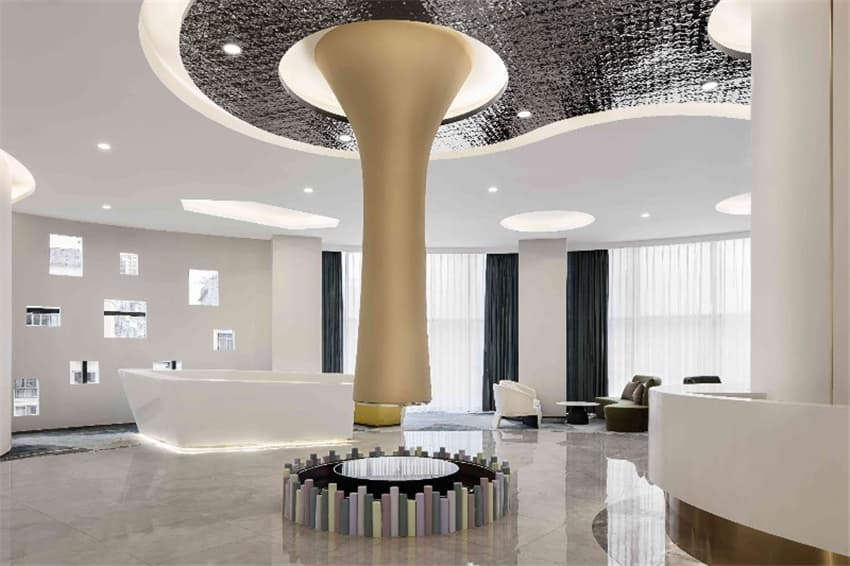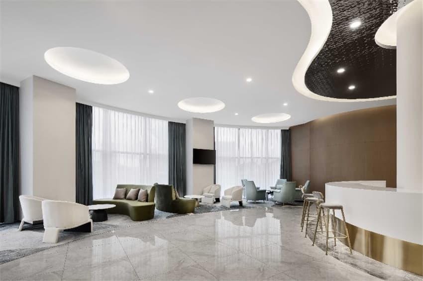 通過前臺(tái)的設(shè)置,讓整個(gè)原本平面的空間結(jié)構(gòu)設(shè)計(jì)成為了恰到好處的存在,形成整個(gè)空間的交通匯聚點(diǎn)。 黃銅金屬與亞克力材質(zhì)的結(jié)合,極具藝術(shù)設(shè)計(jì)感的前臺(tái),摒棄了以往傳統(tǒng)硬板的風(fēng)格,采用去服務(wù)臺(tái)化的設(shè)計(jì),提升了整個(gè)門廳的氛圍感。