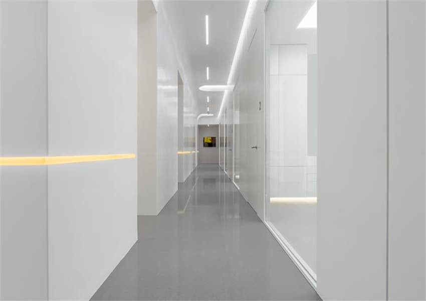 醫(yī)術(shù)與藝術(shù)的相通本質(zhì),引向身心專注的能量場(chǎng),有限界域內(nèi)以創(chuàng)新極簡的當(dāng)代美學(xué),實(shí)現(xiàn)實(shí)用度與設(shè)計(jì)感的平衡,不同功能屬性與專業(yè)度的分區(qū)切割。從前廳的兩道自動(dòng)門分流,經(jīng)當(dāng)代藝術(shù)館式‘回’字形走道連接整合,改善醫(yī)患的動(dòng)線分離且增強(qiáng)空間秩序感。