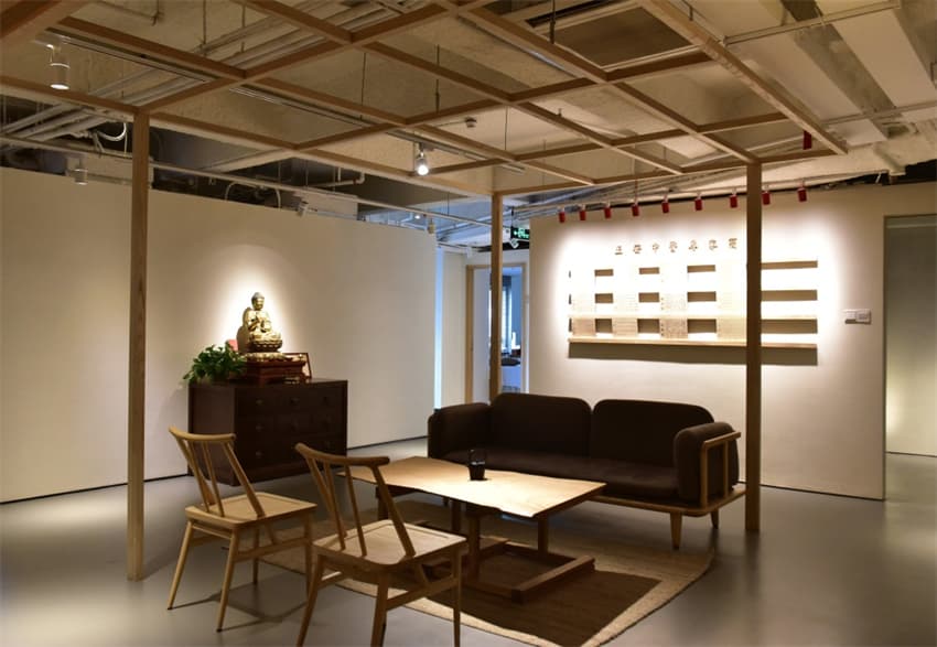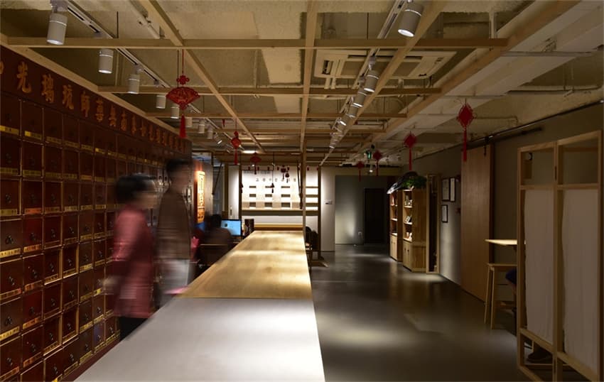 很難想象這樣的醫(yī)館竟坐落于CBD的寫字樓中。沒有自然光線反而更不會被外界所打擾。古香古色的木質(zhì)中藥柜,是從老店直接沿用過來的,與前面的水磨石長調(diào)劑吧臺形成鮮明的對比。這種新與舊的“混淆感”似乎在這個空間里隨處可尋——上方裸露的工業(yè)化管道,與不乏傳統(tǒng)印痕的家具陳設(shè)共成一體。這一切都映射出品牌理念所蘊含的東方智慧。