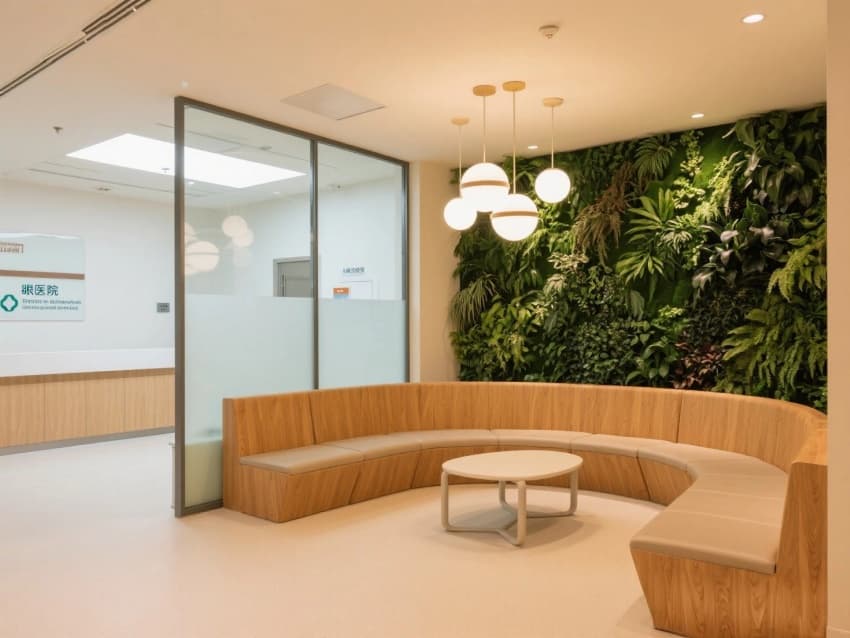 醫(yī)院的大廳采用了柔和的色調(diào),以淺色木質(zhì)材料和白色為主,營造出一種寧靜、舒適的氛圍。前臺設(shè)計簡潔流暢,弧形的線條給人一種柔和的感覺。大廳的一側(cè)是大面積的落地窗,窗外綠意盎然,自然光線充足,讓整個空間顯得更加明亮和開闊。