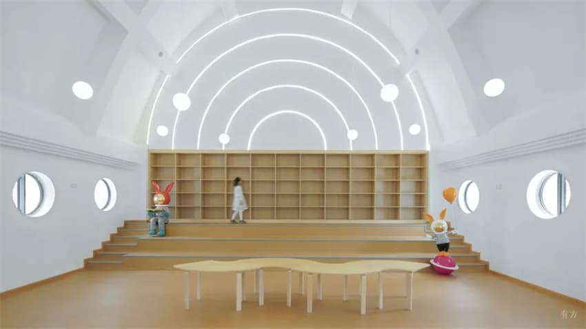 在一系列不同尺度和背景下,獨(dú)特的立面設(shè)計(jì)很好地詮釋了內(nèi)部和外部空間之間的過渡與邊界。大廳以面積的落地窗開放視野,將自然包容進(jìn)教學(xué)空間里,自然舒適地澆灌每一粒好奇的種子。在飛船艙體一般的獨(dú)立拱頂建筑中,孩子們手中的繪本又將打開探索者穿梭星際空間的序章。