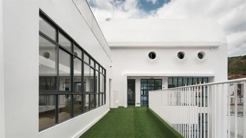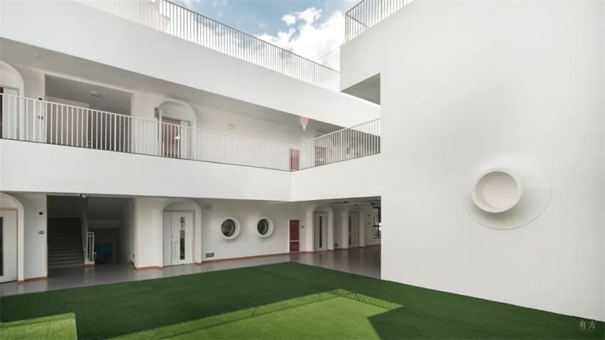 主體建筑物以純白作為主色,在周圍青灰色調(diào)的建筑中脫穎而出,新與舊相映成趣,體現(xiàn)了城市積極的更新關(guān)系,也增添了一份不被世俗捆綁的自由,天空、綠植的本色成為主要的點(diǎn)綴色,孩子們?cè)谄渲写┬斜寂?,抵達(dá)山野林間,也是抵達(dá)理想的未來。