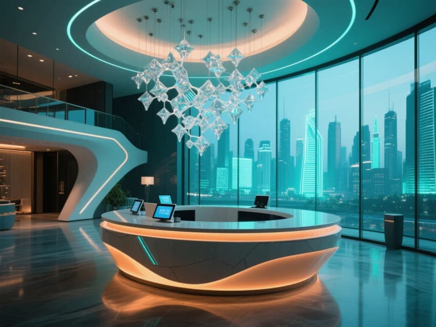 這座未來(lái)主義酒店大堂宛如一座懸浮于時(shí)空夾縫中的水晶宮殿。智能玻璃幕墻如同會(huì)呼吸的肌膚,將整座城市的天際線化作流動(dòng)的畫卷,在透明與朦朧間交替變幻。懸浮式環(huán)形接待臺(tái)似銀河般緩緩旋轉(zhuǎn),全息登記系統(tǒng)投射出的數(shù)據(jù)流如同星辰閃爍,在空氣中勾勒出優(yōu)雅的光痕。