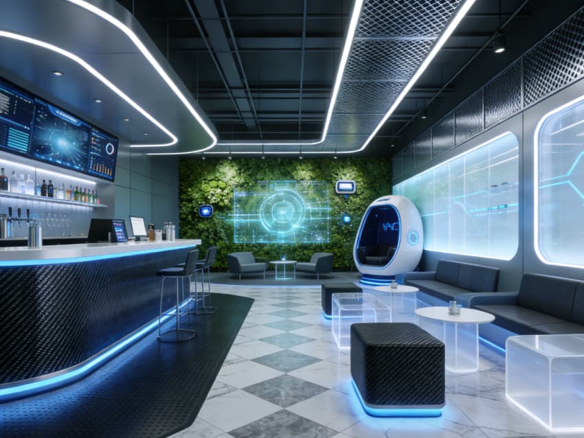 整體以深空灰、科技藍(lán)為主色調(diào),搭配淺灰基底平衡視覺,材質(zhì)選用防靜電地板、隔音環(huán)保板材及磨砂玻璃。墻面局部嵌入數(shù)據(jù)可視化線條與簡約科技元素裝飾,燈光采用分層智能照明系統(tǒng),兼顧專注辦公與氛圍營造。各區(qū)域通過通透隔斷與流暢廊道銜接,既保障研發(fā)、數(shù)據(jù)處理等環(huán)節(jié)的專業(yè)性與私密性,又強(qiáng)化團(tuán)隊(duì)協(xié)作便利性,實(shí)現(xiàn)科技美學(xué)與業(yè)務(wù)功能的深度融合。