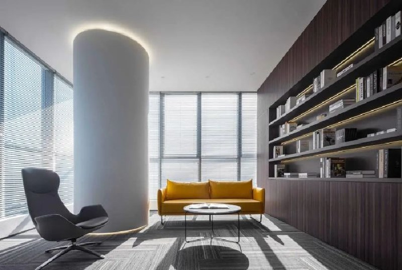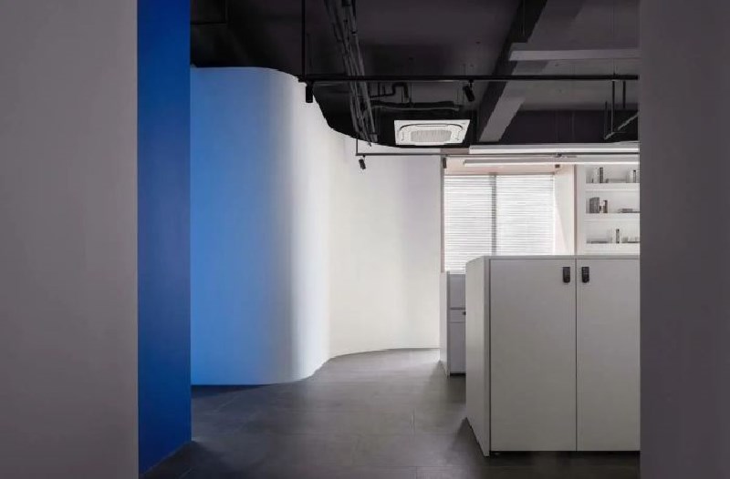 從日常小物到古老建筑,弧形元素都是其中經(jīng)典且永恒的表達(dá)。在本案中,穿插于直線之間的弧形線條猶如充滿流動(dòng)感的向量,隨意延伸著空間的視覺體驗(yàn)和尺度感受,行走之間完全脫離于傳統(tǒng)辦公室的嚴(yán)肅刻板。
