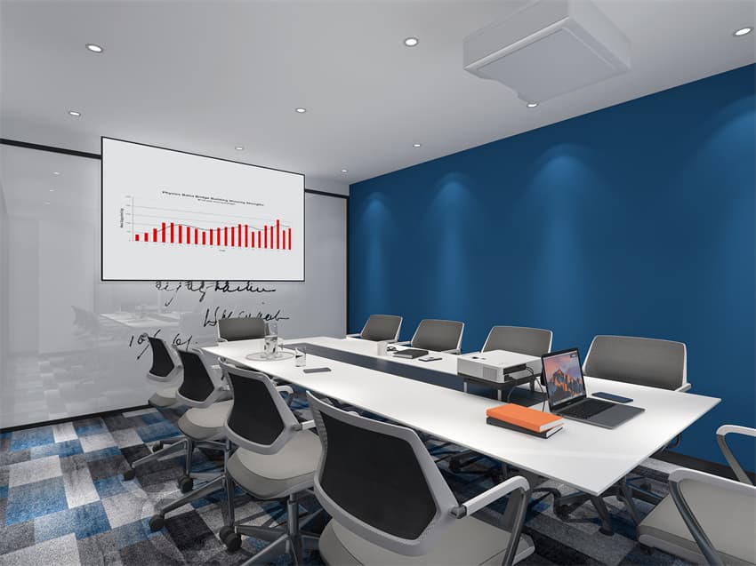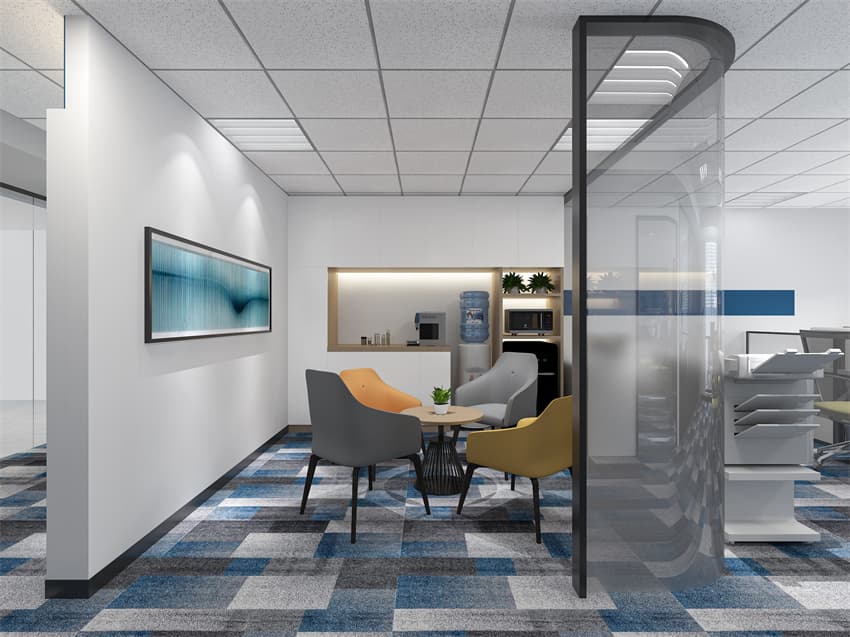 本次設(shè)計(jì)主材運(yùn)用了鋼化玻璃隔斷、蜂窩鋁板、乳膠漆、木飾面、礦棉板、石膏板等常規(guī)材料,具備方便施工、無(wú)毒、防火、隔音等功能。領(lǐng)導(dǎo)辦公室及會(huì)議室的隔墻為鋼化夾絹玻璃,既保證了小空間私密性的同時(shí)又不阻礙大空間的采光。辦公區(qū)的鋁格柵山水紋背景墻的設(shè)置烘托了寄情山水的意境,增加了視覺空間感。整體空間白色蜂窩鋁板及木飾面的運(yùn)用使空間顯得高檔、明亮。空間主要色彩為白色、胡桃木色、灰色、黑色,點(diǎn)綴以綠色、藍(lán)色,除了體現(xiàn)充滿活力的工作狀態(tài),也在表達(dá)青山綠水、和諧共生、可持續(xù)發(fā)展的主題。