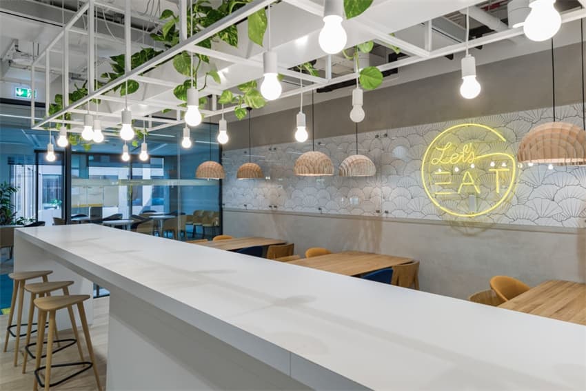 按照計(jì)劃要求,工作站被組織成兩種不同的布局。對(duì)于需要經(jīng)常合作和交流的團(tuán)隊(duì),桌子被放置在推進(jìn)器的形狀——三角形。他們分為6個(gè)社區(qū),每個(gè)社區(qū)由48張桌子組成。IT專家在與開放空間分離的更封閉的豆莢中工作。每個(gè)工作站空間都有特定的功能,例如:會(huì)議室、會(huì)議室、復(fù)印點(diǎn)、電話亭和帶擦板的培訓(xùn)附件。此外,還有兩個(gè)獨(dú)立的咖啡/茶點(diǎn),各種內(nèi)置家具和植物盆,滿足了開放空間。