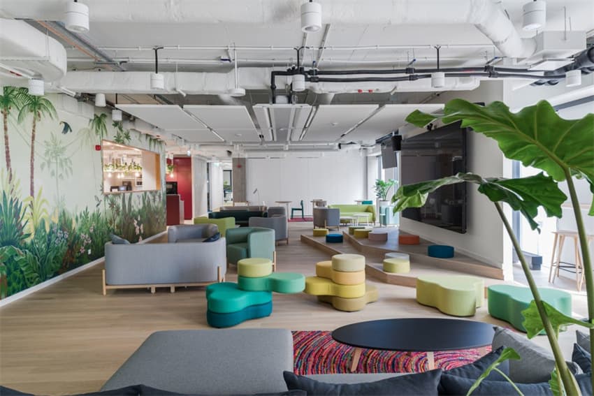 從功能和視覺上與工作站分離的不太正式的區(qū)域?yàn)楦鞣N活動(dòng)提供了非凡的空間。市政廳是最大的房間,中心有高架舞臺(tái),可以用作大型活動(dòng)的區(qū)域,也可以用作俱樂部/咖啡廳,為小團(tuán)體的個(gè)人提供座位??梢酝ㄟ^向培訓(xùn)室開放活動(dòng)墻來(lái)擴(kuò)大空間。它也有通往附屬?gòu)N房的開口??臻g的決定性元素是墻上的壁畫——手繪和單獨(dú)設(shè)計(jì)。休息室較小,以圖書館的風(fēng)格組織,并保留用于相當(dāng)安靜的活動(dòng)。座椅柔軟舒適,顏色自然柔和。相反,游戲室提供了贊美和動(dòng)態(tài)動(dòng)作的可能性。有乒乓球、飛鏢、電視和PlayStation。