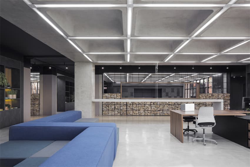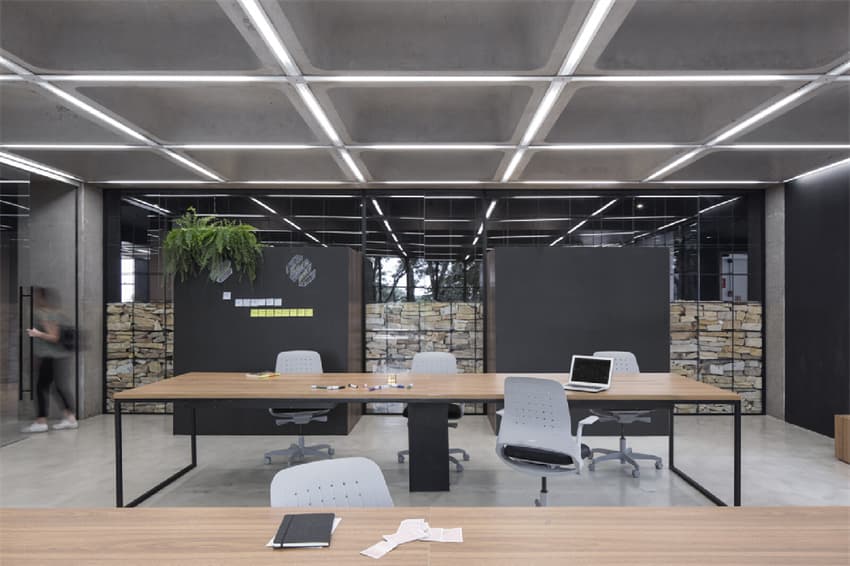 在石籠的南側(cè),行政部門是一個開放空間,由一組相互連接的桌子組成,該設(shè)計旨在提供一個不太嚴格的布局,另一側(cè)分別放置在會議室和會議室。這些空間由淺色和深色木板混合而成。整個南部區(qū)域是相連的,分隔這些房間的門可以打開和嵌入,它們顯示出空間之間的流動,還由建筑師設(shè)計的模塊化沙發(fā)組合,將整個區(qū)域轉(zhuǎn)變?yōu)橐粋€可能的休息室,用于活動或指示。