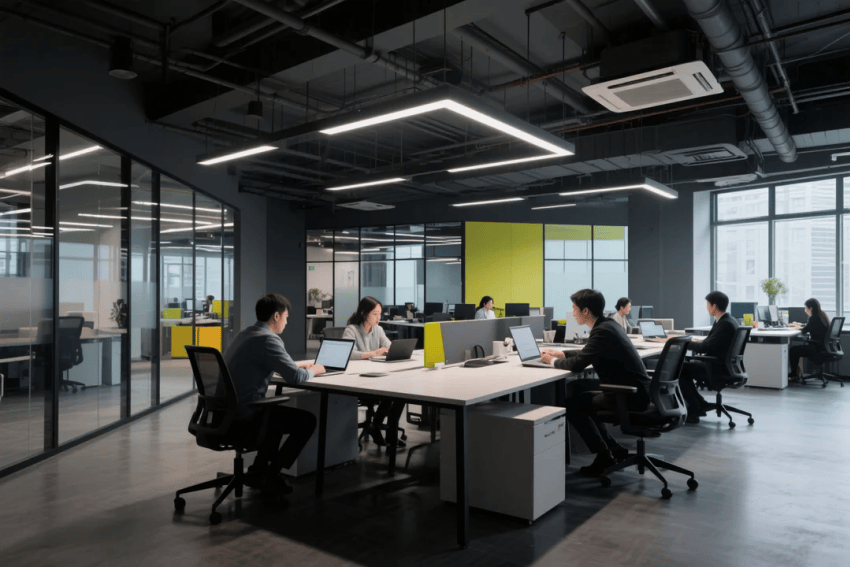 墻面選用深灰藝術(shù)涂料,局部嵌入企業(yè)亮色(如科技藍(lán)或活力橙)的立體品牌標(biāo)識(shí)或線性燈帶,形成鮮明對(duì)比。辦公區(qū)配置黑色鋼架結(jié)構(gòu)的模塊化工位,搭配企業(yè)色跳色的可移動(dòng)儲(chǔ)物柜,既實(shí)用又增強(qiáng)空間活力。會(huì)議室采用深灰玻璃隔斷,內(nèi)部搭配企業(yè)色座椅與定制會(huì)議桌,天花懸掛工業(yè)風(fēng)吊燈,營(yíng)造專(zhuān)注而富有張力的討論氛圍。