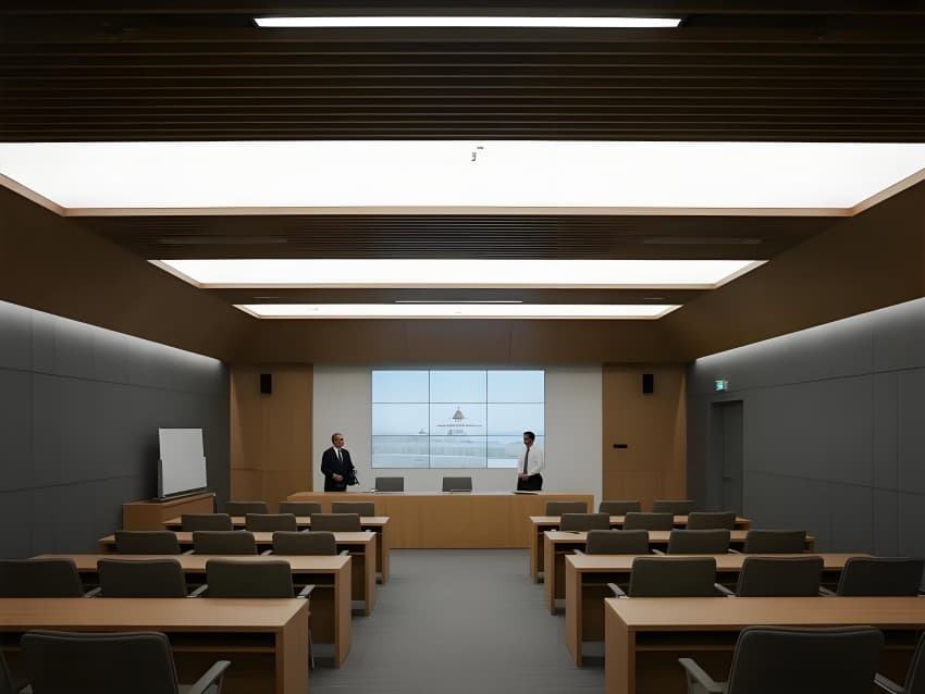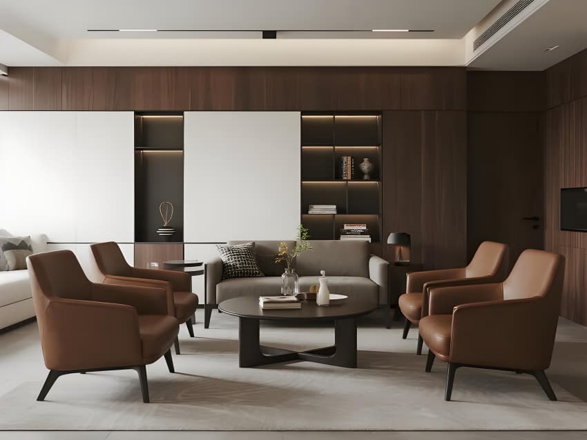 本案以"城市筑夢師"為設(shè)計理念,融合地產(chǎn)專業(yè)性與未來生活美學(xué)。空間采用現(xiàn)代簡約語言,主色調(diào)為高級灰基底,香檳金提升品質(zhì)感,企業(yè)藍強化品牌識別。核心區(qū)域突破傳統(tǒng):大堂變身數(shù)字規(guī)劃館,沙盤區(qū)升級全息城市模型,洽談室植入智能環(huán)境控制系統(tǒng)。