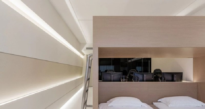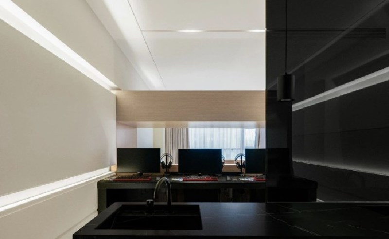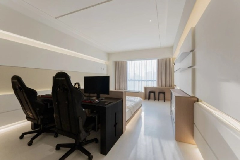 電競酒店成為城市的第三空間,作為年輕人的聚集點,甚至成了“社交幣”的一種說法等,這里除了住,還可以玩。這種可見的效應讓空間設計成了電競酒店和設計師展現(xiàn)構想的舞臺,也成為了人們勇于表達想法,獲得共鳴的場所。 迷你吧、衣柜、電腦、床被有效組合,分隔出玄關、電競區(qū)、臥室空間。各個區(qū)域的領域感得到加強的同時,保證了整體空間的流動性并加強了空間的層次感。