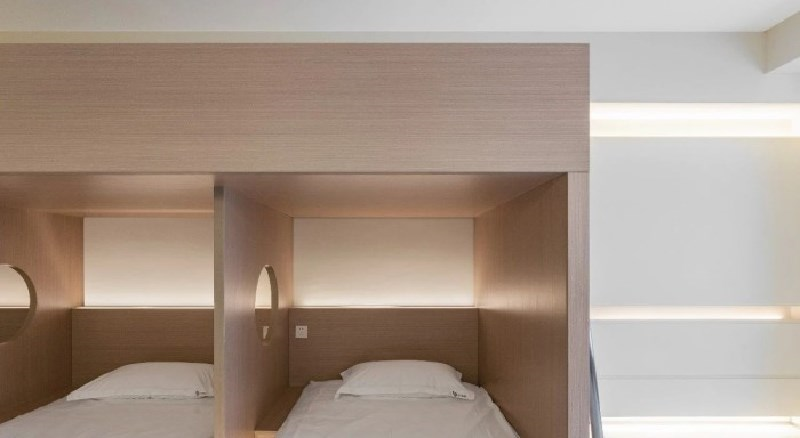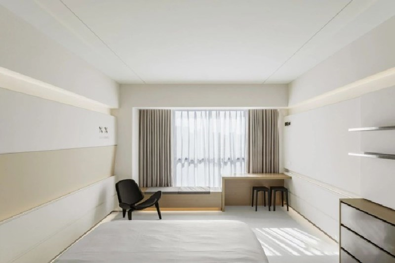 客房必備的功能模塊不再常規(guī)地分散布置在平面中,而是整合成體塊,成為分隔空間的置入物。日光通過窗口射入,溫潤的原木色床與白色墻面相融合,給整個房間帶來了一種凝聚舒緩的氣氛。無論造型如何千變萬化,點、線、面、體都是其變換的基點,摒棄隱晦的藏匿,配合純粹與留白,既肆意展開又有所保留,滿足人們的探索性與好奇心。一種無形的感受,一種流動著的狀態(tài),在某一個節(jié)點,人會擁有同樣的情感認知,短暫而美好。