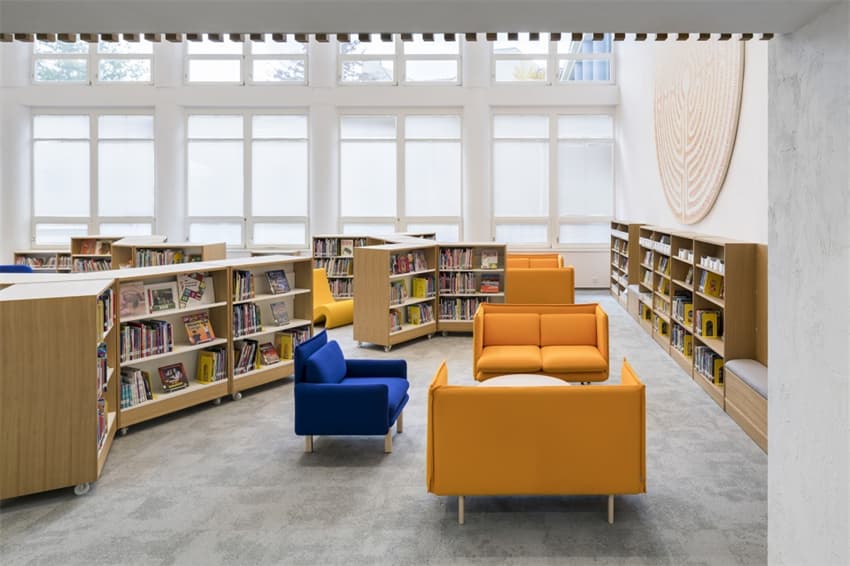 夾層的開放空間具有友好的環(huán)境,用作閱覽室或會見場所。設(shè)計師受辦公空間啟發(fā),在夾層增設(shè)了隔音電話亭。面向圖書區(qū)域的開洞使閱覽室/自習(xí)室充滿活力。的房間沒有明確功能。多功能空間可以用作日常會議室、視頻會議室或教室。