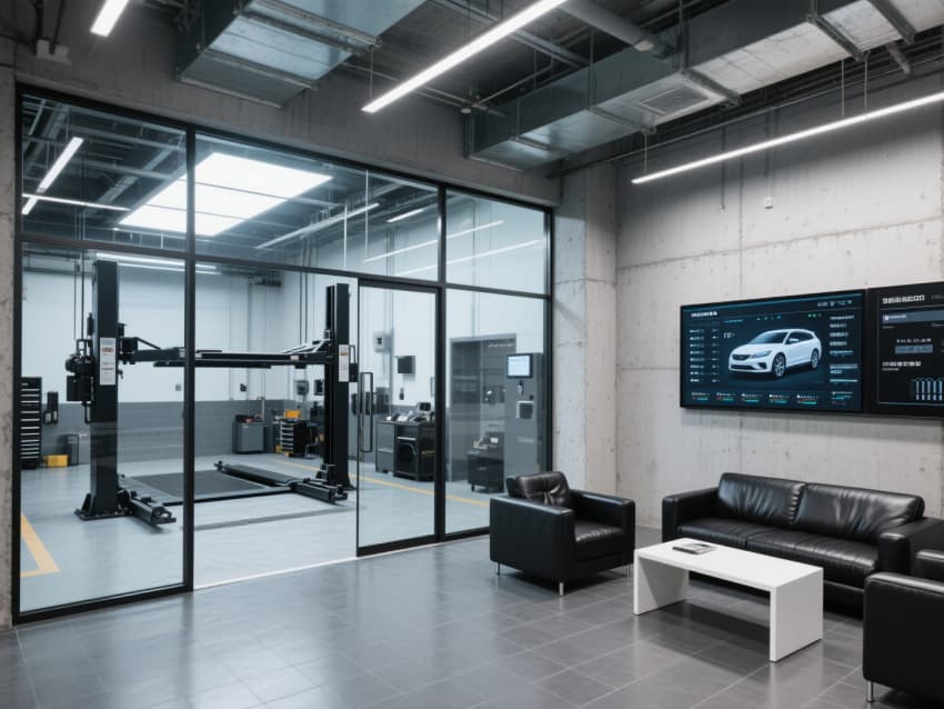車輛展示區(qū)采用超高挑高設(shè)計(jì),地面鋪設(shè)無(wú)縫環(huán)氧地坪,搭配可調(diào)節(jié)軌道射燈,精準(zhǔn)照亮車身線條;洽談區(qū)以半通透金屬網(wǎng)隔斷,配備嵌入式智能交互屏的桌椅,墻面嵌入品牌文化數(shù)字展墻。維修區(qū)地面做防滑耐磨處理,天花懸掛工業(yè)風(fēng)管線式吊燈,設(shè)備收納柜采用模塊化設(shè)計(jì),與墻面齊平保持整潔。?