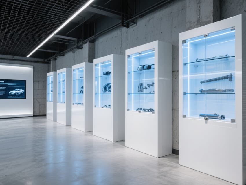 各區(qū)域通過(guò)統(tǒng)一的金屬收邊與科技燈帶串聯(lián),入口處設(shè)置品牌LOGO發(fā)光墻,走廊嵌入車輛參數(shù)展示屏。既保留工業(yè)風(fēng)的利落結(jié)構(gòu),又以科技元素提升體驗(yàn)感,完美契合汽車4S店的專業(yè)屬性與高端定位。