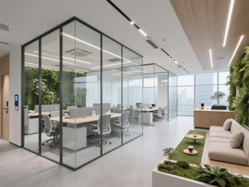 空間布局:開放式辦公區(qū)結(jié)合模塊化獨(dú)立會(huì)議室,智能玻璃隔斷實(shí)現(xiàn)空間自由轉(zhuǎn)換。