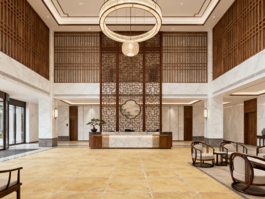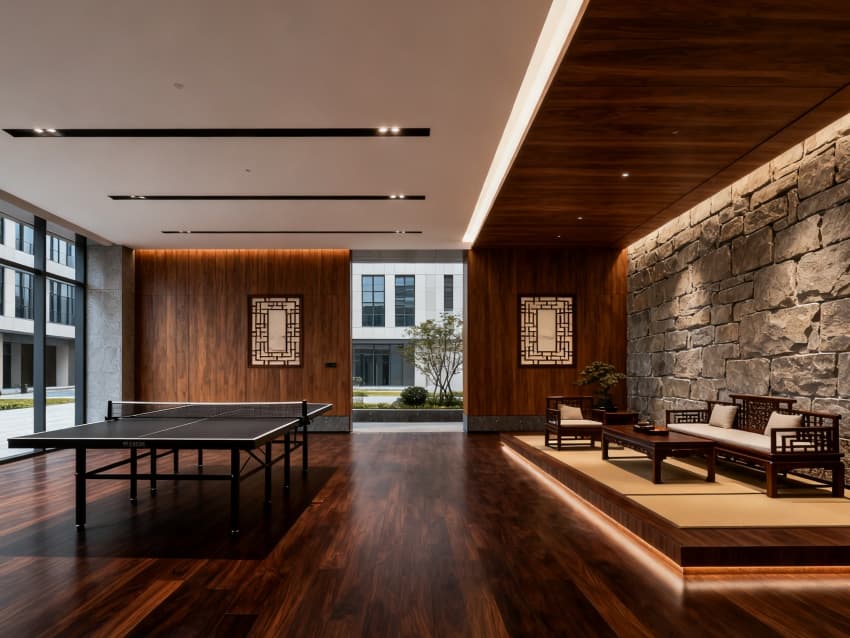 整體以淺米白、深棕、淺木色為基調(diào),通過(guò)統(tǒng)一材質(zhì)(實(shí)木、金屬、石材、格柵)貫穿三層,既避免空間割裂,又以中式元素(紋樣、格柵、水墨)傳遞文化內(nèi)涵,讓2400㎡獨(dú)棟空間兼具“高效辦公”與“文化表達(dá)”雙重屬性,適配注重品牌氣質(zhì)的中高端企業(yè)。