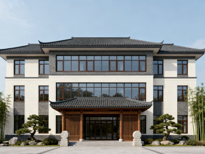 該三層獨(dú)棟辦公樓以“現(xiàn)代新中式?雅致辦公”為核心設(shè)計(jì)理念,聚焦中高端企業(yè)“獨(dú)立空間+文化彰顯”的需求,按“公共接待-核心辦公-私密決策”垂直邏輯規(guī)劃,內(nèi)外風(fēng)格統(tǒng)一且兼具傳統(tǒng)韻味與現(xiàn)代感。外立面采用淺米白真石漆與深棕金屬線條勾勒,搭配定制中式格柵窗與坡屋頂設(shè)計(jì),局部嵌入景墻與小型庭院,門前鋪設(shè)青石板步道,既保留中式建筑的雅致,又通過(guò)大面積玻璃保障室內(nèi)采光,弱化獨(dú)棟建筑的封閉感。?