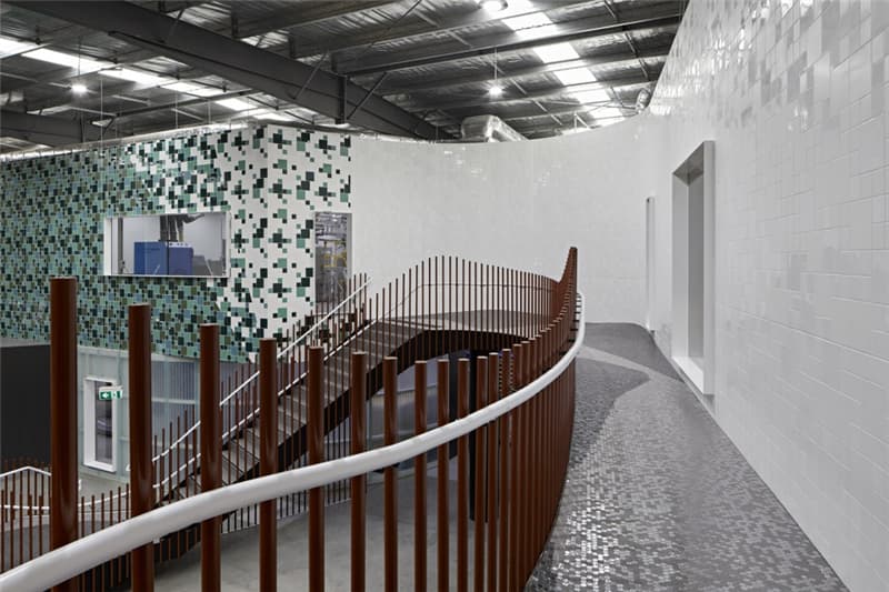 多彩的線條從附近的自然保護(hù)區(qū)一直延伸到位于生產(chǎn)區(qū)核心地帶的巨型壁畫上,吸引著員工和參觀工廠的訪客。產(chǎn)自本地的澳洲硬木和紋理豐富的墻面從外部景觀“流進(jìn)”室內(nèi),在自然光線的配合下營造出富有生機的氛圍。