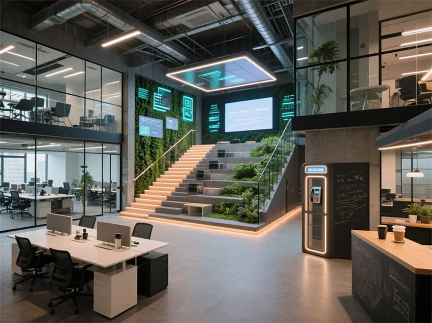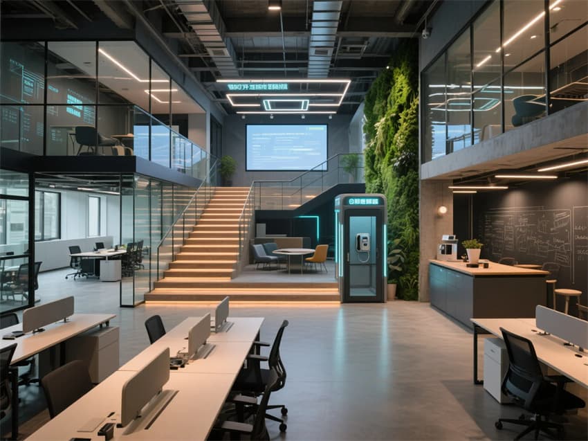 創(chuàng)意角落:賽博朋克風(fēng)電話亭、極簡咖啡吧、可書寫玻璃墻,激發(fā)靈感碰撞。