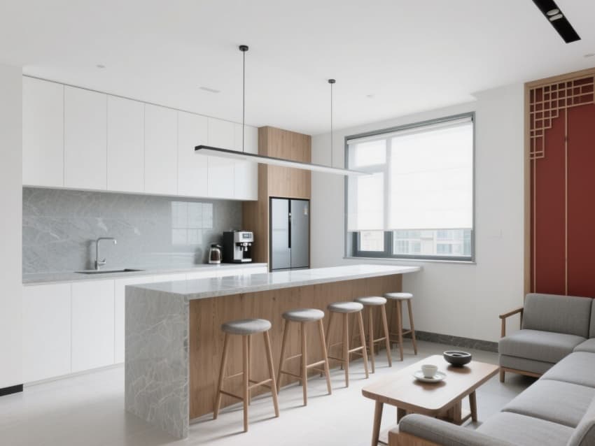 這套辦公設計巧妙融合現(xiàn)代簡約與新中式美學,打造出雅致且高效的辦公空間。前臺以大理石接待臺為核心,搭配藍白紅撞色背景墻與精致品牌標識,盡顯專業(yè)大氣的第一印象。開放辦公區(qū)采用玻璃隔斷保障采光,簡潔的桌椅布局與中式裝飾畫相得益彰,既營造出通透協(xié)作的工作氛圍,又傳遞出文化韻味。總經理辦公室通過木質辦公家具、充足自然光線及城市景觀窗,平衡了商務穩(wěn)重與開闊舒適感。會議室配備專業(yè)投影設備,燈光與材質的搭配讓空間兼具專業(yè)與溫馨,滿足高效會議需求。此外,休閑區(qū)的現(xiàn)代吧臺、舒適座椅,以及新中式洽談區(qū)的山水掛畫、格柵隔斷,為員工與客戶提供了放松交流的雅致場所,整體設計在功能與美學間實現(xiàn)了精妙平衡。