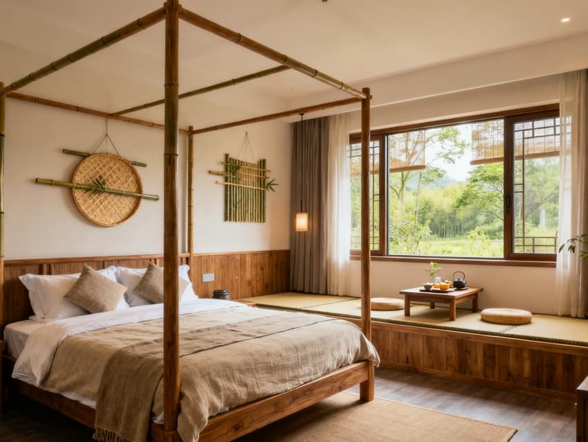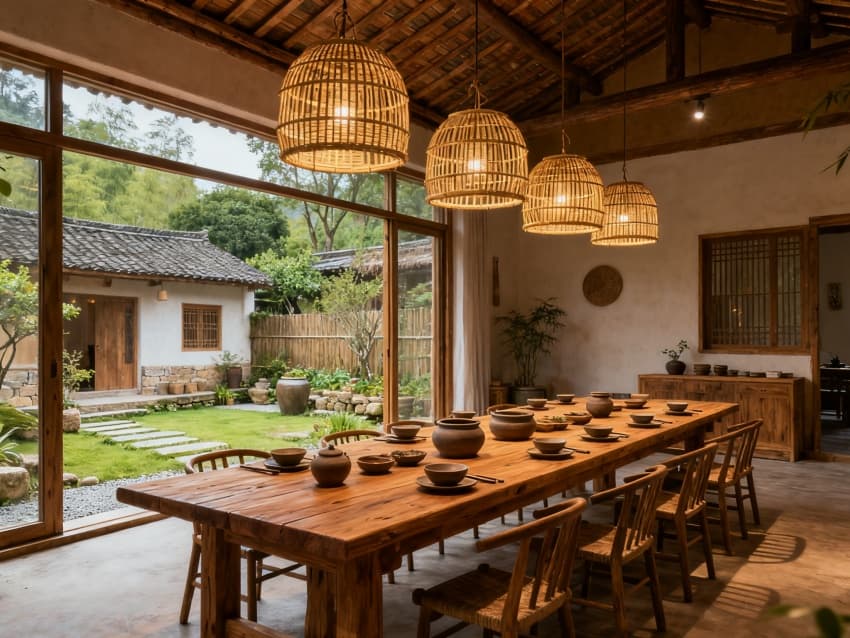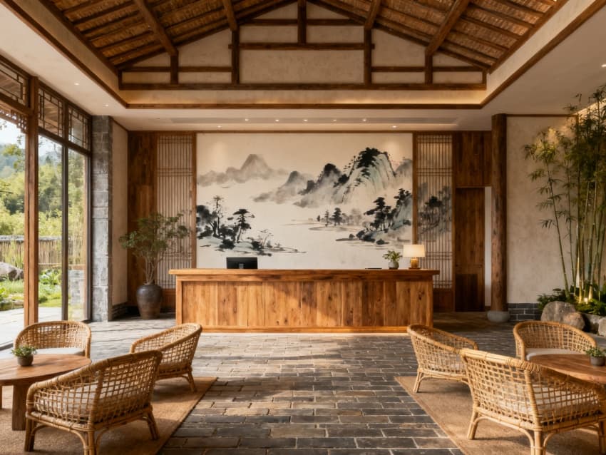 整體以淺木色、米白色、黛青色為基調(diào),通過統(tǒng)一材質(zhì)(原木、棉麻、竹編)貫穿空間,既避免功能分區(qū)的視覺割裂,又以自然元素弱化商業(yè)感,讓2300平空間成為“可居、可游、可體驗”的田園棲居地,適配中高端民宿的定位需求。