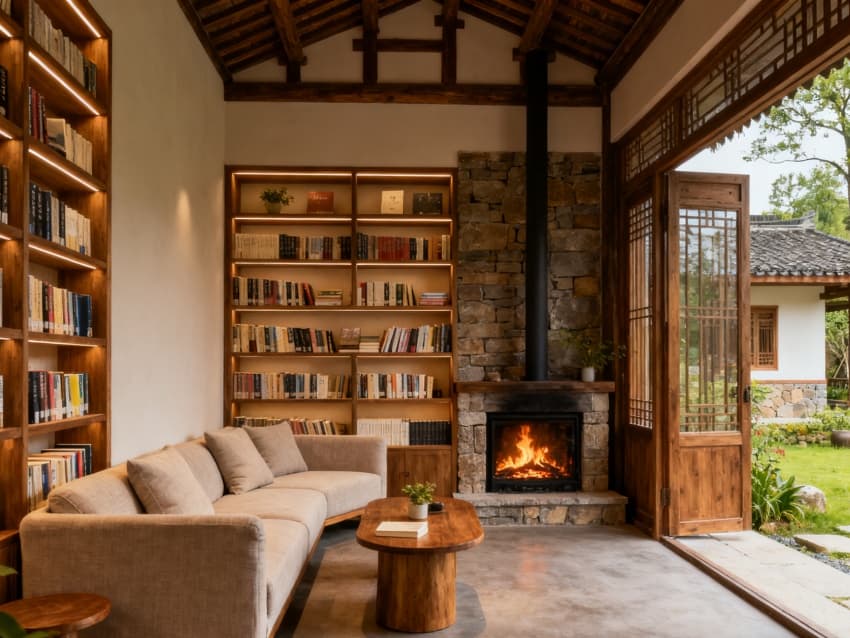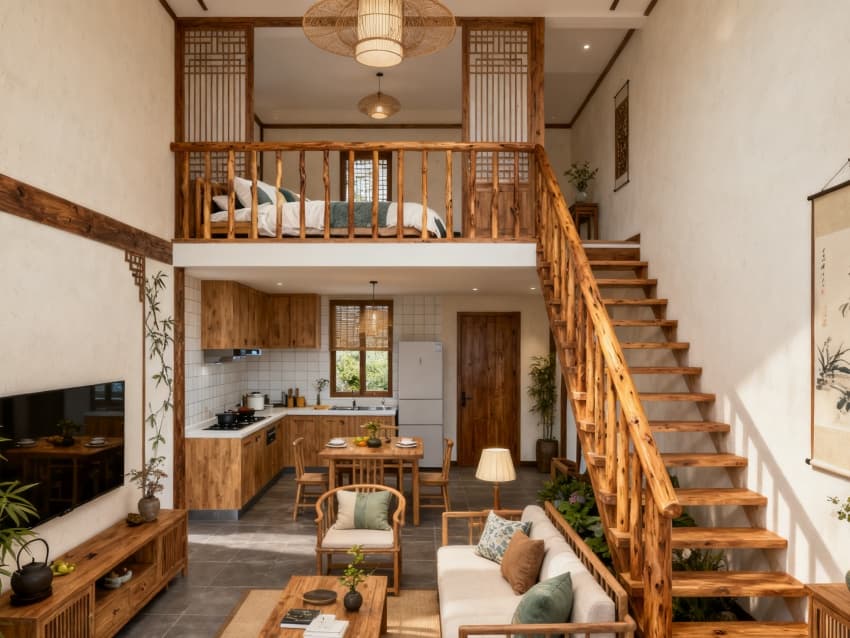 •     該2300平民宿以“新中式田園?自然共生”為核心設計理念,聚焦都市人“逃離喧囂、親近自然”的需求,按“住宿核心-公共休閑-在地體驗”的邏輯規(guī)劃空間,內(nèi)外風格統(tǒng)一且充滿人文質(zhì)感。外立面采用淺原木色防腐板材與白墻拼接,黛青色瓦片勾勒屋頂輪廓,搭配木質(zhì)格柵窗與門前竹編矮欄,局部點綴陶罐綠植,既還原中式田園的雅致韻味,又通過通透設計保障室內(nèi)采光,門前小徑鋪青石板,強化“歸家”的儀式感。?
