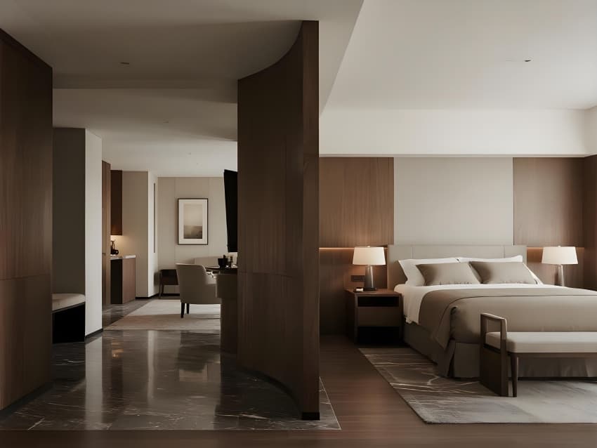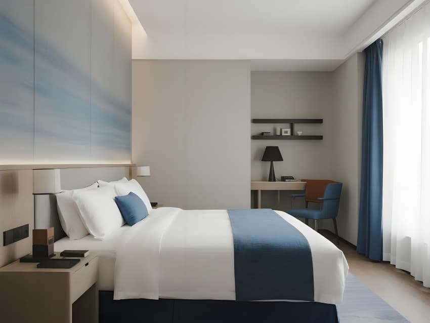 科技系統(tǒng)優(yōu)雅隱匿:無(wú)感入住人臉識(shí)別,環(huán)境音樂(lè)分區(qū)調(diào)控,客房魔鏡交互系統(tǒng)。材質(zhì)精選微水泥、再生金屬網(wǎng)、聲學(xué)織物,在克制美學(xué)中暗藏驚喜。最終呈現(xiàn)一個(gè)既具商務(wù)效率又有藝文溫度的城市棲息地。