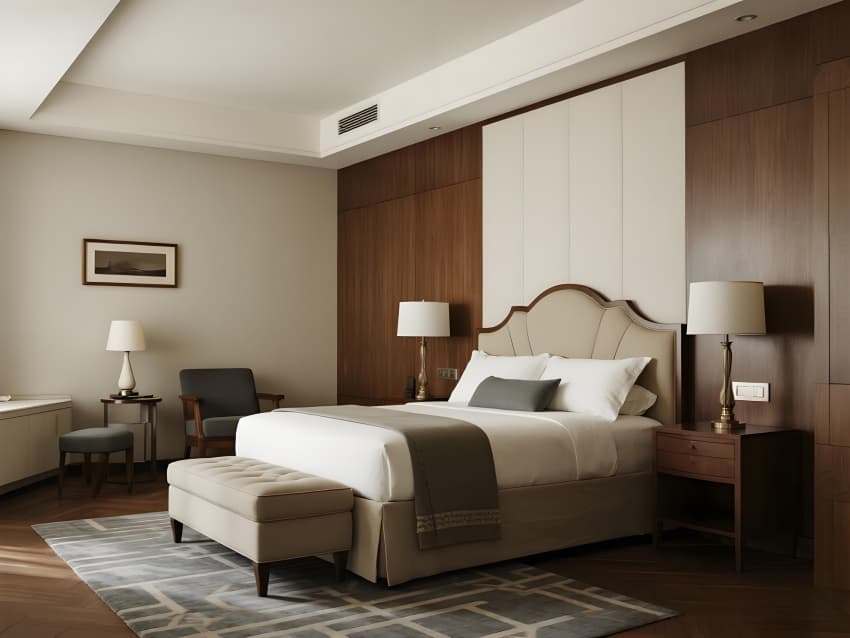 本案以"城市會(huì)客廳"為定位,打造商務(wù)與藝術(shù)共生的精品酒店。建筑采用"垂直庭院"概念,主色調(diào)演繹材質(zhì)本質(zhì):象牙白墻面如雕塑基底,古銅金細(xì)節(jié)勾勒輕奢輪廓,橄欖綠軟裝注入自然生機(jī)。功能設(shè)計(jì)突破傳統(tǒng):大堂融合數(shù)字藝術(shù)展,客房植入智能情景模式,餐廳設(shè)置主廚劇場(chǎng)。