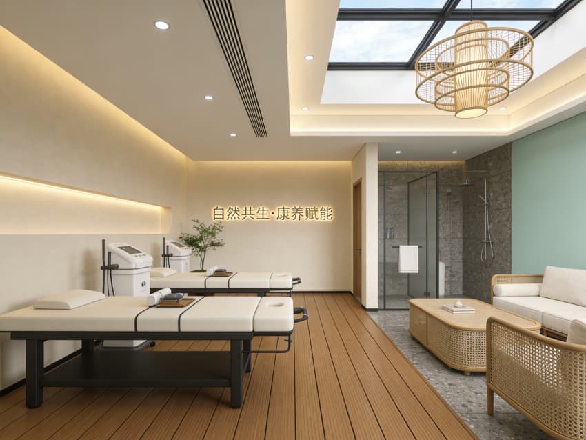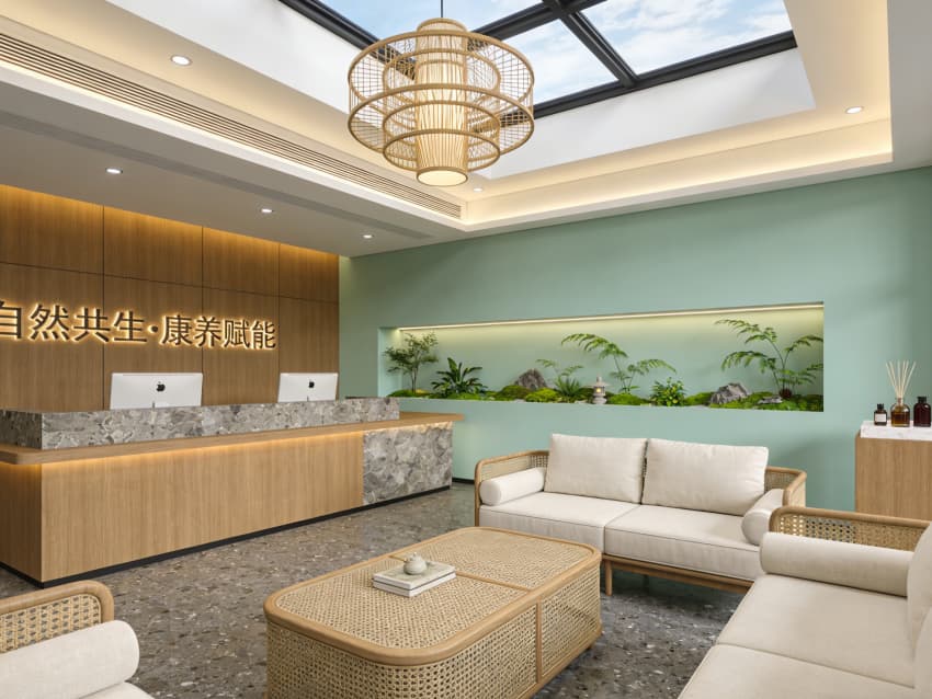 整體空間采用侘寂風(fēng)與自然康養(yǎng)結(jié)合的設(shè)計(jì)語(yǔ)言,以原木、藤編、石材為核心材質(zhì),搭配淺綠、米白等柔和色調(diào),營(yíng)造出溫暖松弛的氛圍。接待大堂以淺木色與天然石材拼接的前臺(tái)為視覺(jué)核心,背景墻嵌入綠植造景,頂層天窗引入自然天光,竹編吊燈的層疊造型呼應(yīng)溫泉的流動(dòng)感,“自然共生?康養(yǎng)賦能” 的發(fā)光標(biāo)識(shí)強(qiáng)化空間主題,讓住客踏入酒店的第一刻便沉浸在療愈氛圍中。