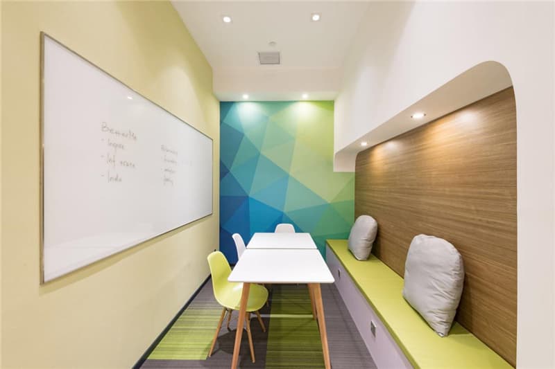 該辦公空間設(shè)計共包含八間教室、一個教師辦公室和休息室、儲藏室。在教室的設(shè)計上,設(shè)計師盡可能將對空間的干預(yù)降到最低。采用漸變色的壁紙,讓教室不會顯的沉悶,思維的開拓不管對于誰都是很重要的,通過綠植的裝飾和軟裝的簡要搭配,讓此處有了不一樣的風情,在這里盡情討論學習進度,互相的分享心得,在彼此交流中互相成長。