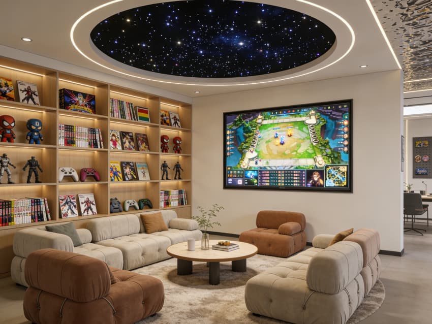 以星空頂投影與巨幕游戲屏為核心,搭配潮玩主題書(shū)架與懶人沙發(fā),打造 “游戲化” 休閑場(chǎng)景,既支持團(tuán)隊(duì)開(kāi)黑、頭腦風(fēng)暴,也能成為新人破冰、節(jié)日?qǐng)F(tuán)建的活力場(chǎng)域,有效增強(qiáng)團(tuán)隊(duì)凝聚力。