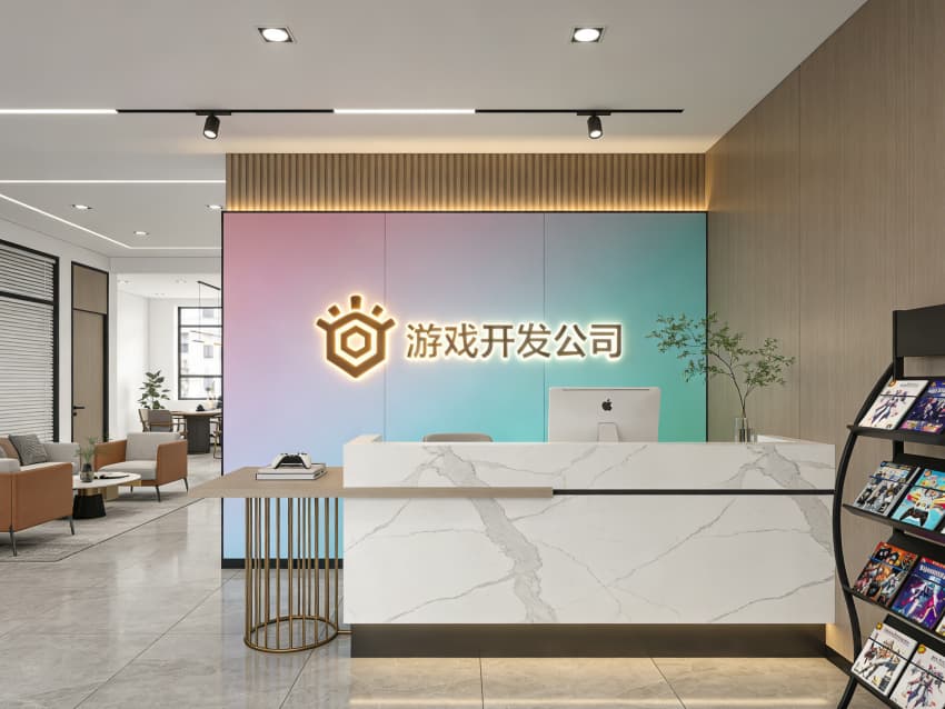 以漸變色彩背景墻搭配發(fā)光 LOGO,結(jié)合大理石前臺(tái)與游戲周邊展示架,第一時(shí)間傳遞年輕、活力的品牌氣質(zhì),讓訪客踏入空間即感受到濃厚的游戲氛圍。