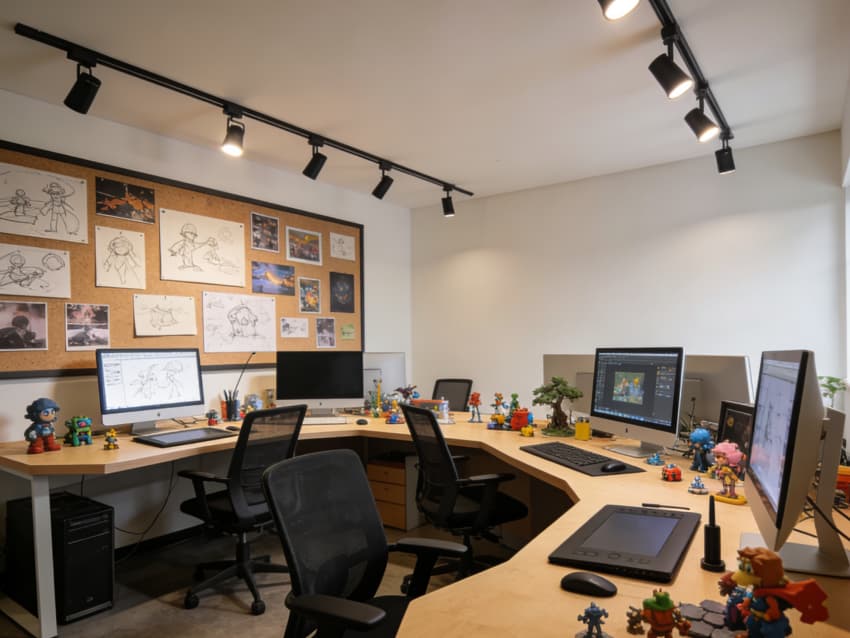 弧形開(kāi)放式工位搭配軟木板展示墻,可隨時(shí)貼放手繪稿與創(chuàng)意草圖,潮玩擺件與軌道燈聚焦設(shè)計(jì)作品,激發(fā) UI、原畫(huà)設(shè)計(jì)師的創(chuàng)作靈感,讓創(chuàng)意可視化、可碰撞。