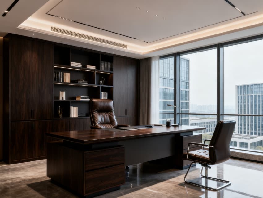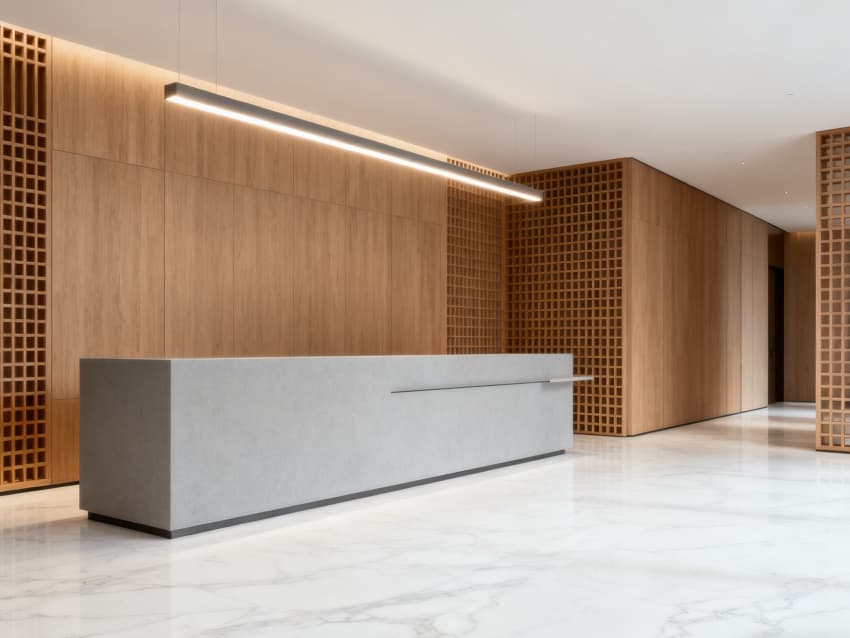 內(nèi)部空間延續(xù)外立面的簡(jiǎn)約調(diào)性:辦公區(qū)用淺灰地毯搭配白色辦公桌,淺木色隔斷增添溫潤(rùn)感;會(huì)議室以深灰墻面搭配白色吊頂,嵌入式燈光提升精致度;接待區(qū)用淺灰沙發(fā)搭配白色茶幾,綠植點(diǎn)綴增添生機(jī);走廊采用淺灰地磚與白色墻面,線性燈帶延伸空間縱深感;茶水間則以淺木色柜體搭配白色臺(tái)面,簡(jiǎn)潔實(shí)用。整體通過(guò)統(tǒng)一的色彩與材質(zhì),打造出舒適且專(zhuān)業(yè)的辦公環(huán)境。