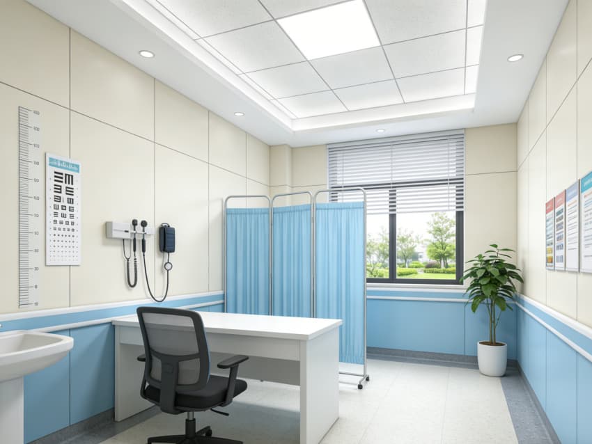 內(nèi)部功能分區(qū)清晰合理,涵蓋掛號繳費區(qū)、全科診療室、輸液觀察區(qū)、藥房取藥區(qū)、預(yù)防接種室及健康宣教區(qū)。診療室采用通透玻璃隔斷搭配窗簾,兼顧隱私與采光;輸液區(qū)配備舒適躺椅與陪護(hù)座椅,點綴綠植緩解緊張情緒;接種室針對兒童群體優(yōu)化設(shè)計,營造溫和友好氛圍。