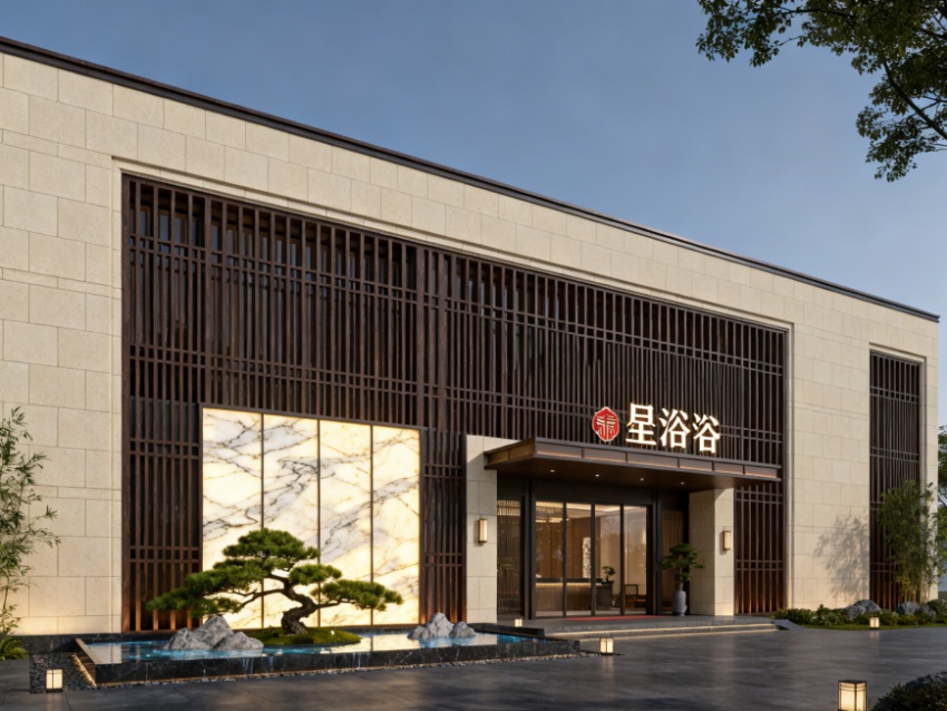 本2500㎡足浴養(yǎng)生會所以“禪意東方?靜謐療愈”為核心,實(shí)現(xiàn)外立面與內(nèi)部空間的風(fēng)格統(tǒng)一及功能適配。外立面采用淺米黃石材搭配深棕色木格柵,融入圓月造型裝飾與垂直綠植,既彰顯雅致格調(diào),又傳遞自然養(yǎng)生理念,與內(nèi)部禪意氛圍形成呼應(yīng)。?