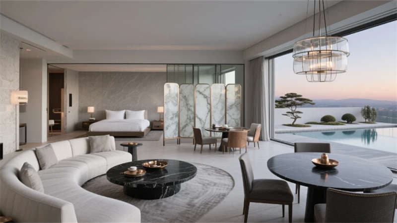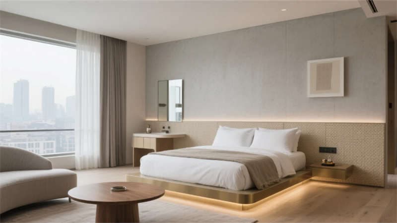 步入挑高的大堂,原木與石材的碰撞詮釋著質(zhì)樸的高級(jí)感。懸浮玻璃樓梯如透明絲帶盤旋而上,紙藝褶皺吊燈灑下柔和光暈,綠植墻在隱藏式燈光中若隱若現(xiàn),仿若一幅當(dāng)代山水畫卷。客房以暖灰與米白為基調(diào),亞麻、微水泥與天然木紋織就療愈氛圍,弧形沙發(fā)與嵌入式燈帶讓空間流動(dòng)著溫柔詩意,落地窗將城市天際線化為朦朧背景。