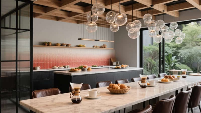 全日餐廳以陶土色格柵天花呼應(yīng)徽州傳統(tǒng)工藝,吹制玻璃吊燈如晨露凝結(jié)空中;宴會(huì)廳則化身未來劇場(chǎng),波浪形織物天花與全息投影幕布共舞光影。行政樓層的商務(wù)休息區(qū),深灰毛氈墻面與古銅金屬細(xì)節(jié)沉淀出理性優(yōu)雅,窗外綠意透過玻璃隔斷滲入交談空間。從屋頂無邊泳池俯瞰,建筑與巢湖的瀲滟水色遙相呼應(yīng),于繁華處開辟一方隱逸凈土——這里不僅是居所,更是一場(chǎng)喚醒感官的設(shè)計(jì)敘事。