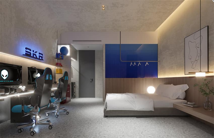 相信很多電競酒店投資人在籌備設(shè)計時,都會思索如何將電競元素和入住體驗(yàn)完美融合。一方面需考慮符合電競愛好者審美,增加潮酷元素;另一方面則需考慮睡眠質(zhì)量,減少炫目元素。