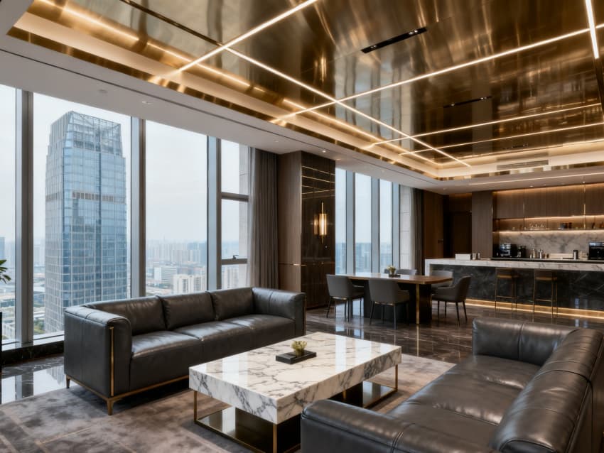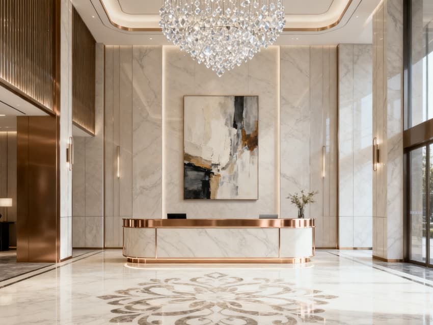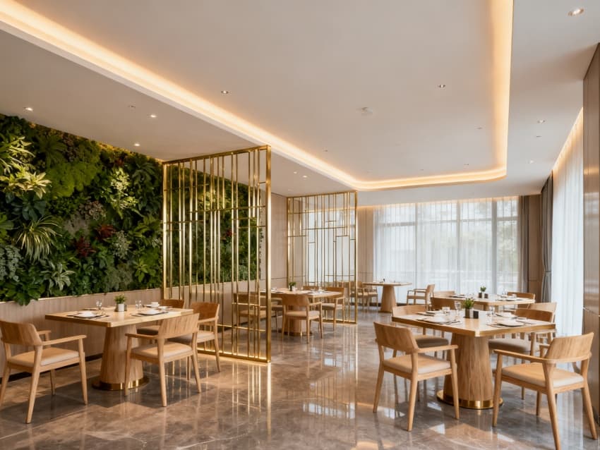 內(nèi)部空間延續(xù)外立面的輕奢調(diào)性:大堂用米白大理石地面搭配深棕實(shí)木接待臺(tái),金屬吊燈提升精致度;客房以淺灰軟裝搭配米白墻面,深棕木質(zhì)家具增添溫潤(rùn)感;餐廳用淺金金屬隔斷劃分區(qū)域,米白餐桌搭配灰色餐椅,簡(jiǎn)約又顯格調(diào);休閑區(qū)用淺灰布藝沙發(fā)搭配玻璃茶幾,綠植點(diǎn)綴增添生機(jī);走廊采用淺灰地毯與米白墻面,壁燈暖光營(yíng)造靜謐氛圍。整體通過統(tǒng)一的色彩與材質(zhì),打造出舒適高端的住宿體驗(yàn)。