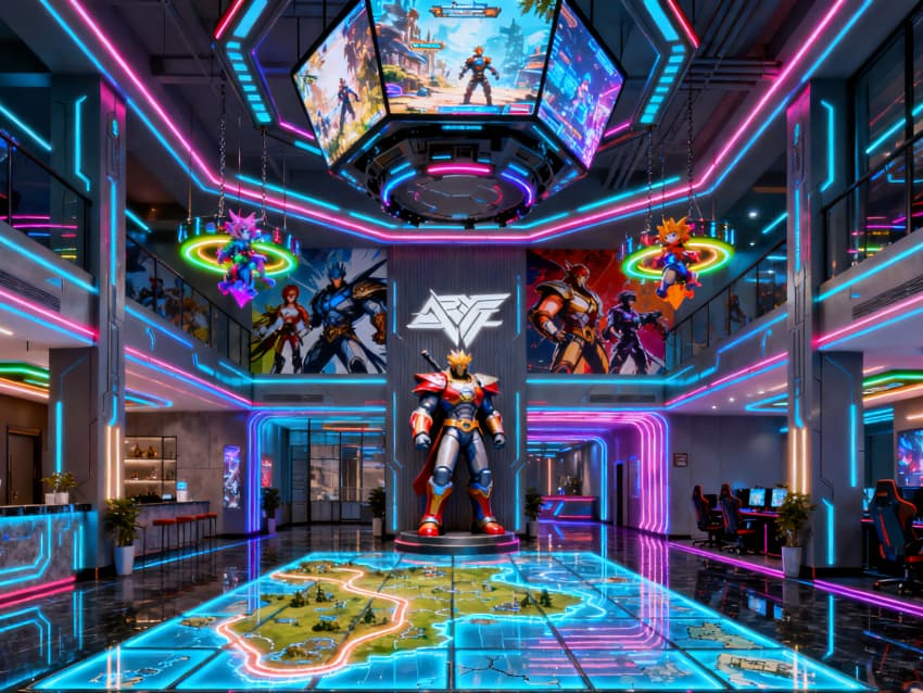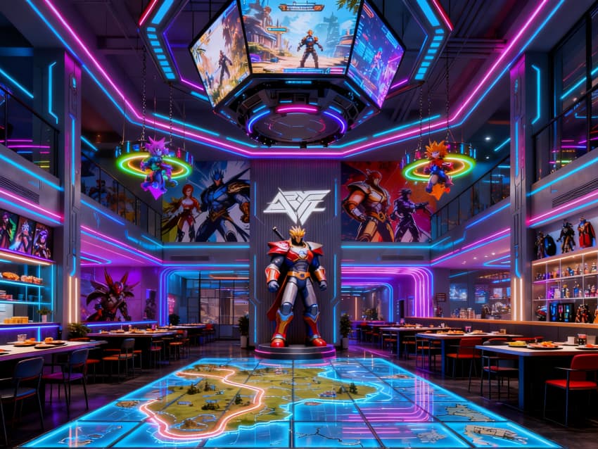 整體以科技藍(lán)、霓虹紫為基調(diào),搭配游戲IP專屬配色,材質(zhì)選用耐磨防滑的工業(yè)風(fēng)地磚、防刮耐磨壁紙,墻面嵌入游戲場景壁畫與發(fā)光LOGO。6100㎡空間動線流暢,各區(qū)域通過IP元素自然銜接,既滿足玩家電競娛樂與住宿需求,又通過細(xì)節(jié)打磨強(qiáng)化主題沉浸感,實(shí)現(xiàn)潮流電競與IP文化的深度融合。