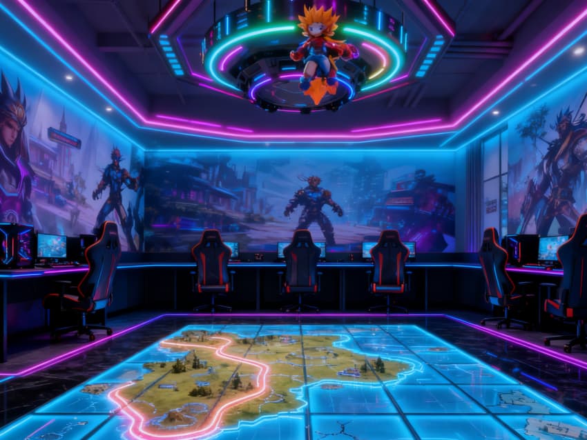 空間規(guī)劃清晰適配需求,涵蓋IP主題大廳、單人電競房、雙人協(xié)作房、四人開黑房、六人團(tuán)戰(zhàn)房及休閑社交區(qū)。大廳以游戲世界觀為藍(lán)本,搭配LED動態(tài)屏、角色雕塑與主題燈光,打造視覺焦點(diǎn);各房型依IP特色差異化設(shè)計(jì),配備高配置電競設(shè)備與定制軟裝,隔音隔斷保障沉浸式體驗(yàn);休閑區(qū)設(shè)置游戲周邊展架與互動裝置,強(qiáng)化社交屬性。